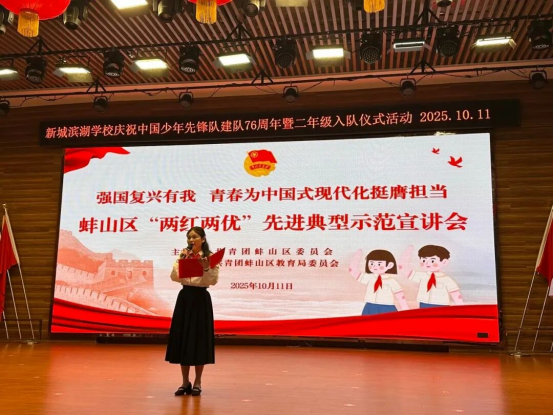 宣讲会上,荣获“2025年安徽省优秀共青团干部”的新城滨湖学校大队辅导员杨艺老师以《强国复兴有我,红领巾时刻准备着》为主题,用三个关键词串联起感人至深的宣讲。她立足岗位实践,讲述了两则育人故事:一束光的温暖,展现了教育者用鼓励点燃学生自信;一场成长的接力赛,诠释了历史使命的代代传承。她向同学们提出三点期望:做“有根”的人,扎根中华文化沃土;做“有心”的人,永葆好奇善良与坚强;做“有行动”的人,将爱国情怀转化为日常实践,激励同学们肩负起民族复兴的历史重任,用点滴行动汇聚成建设祖国的磅礴力量。