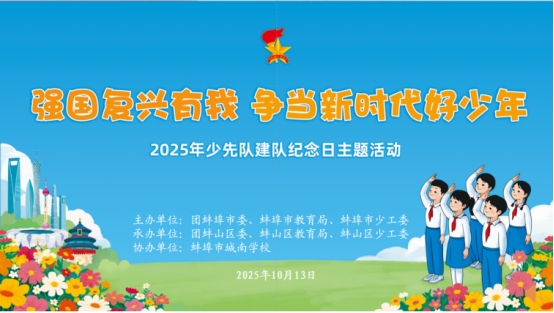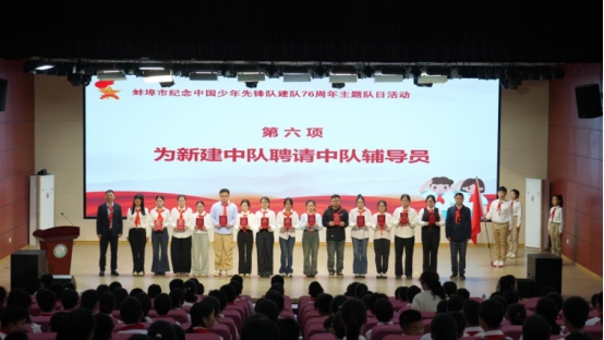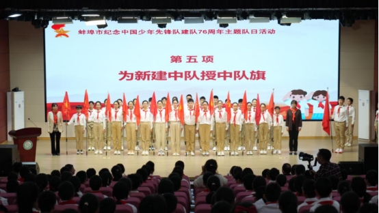 10月13日,在中国少年先锋队建队76周年之际,由团市委、市教育局、市少工委主办,团蚌山区委、蚌山区教育局、蚌山区少工委承办的“强国复兴有我 争当新时代好少年”蚌埠市少先队建队纪念日主题活动在蚌埠市城南学校隆重举行。市委常委、统战部部长张晓静,团市委、市教育局相关负责同志,蚌山区相关领导出席活动,蚌埠市城南学校师生代表共计300余人参加活动。