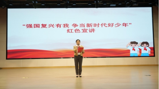 随后,在红色宣讲环节中,宣讲员们用真挚的语言讲述红色故事,传递信仰力量。第九次全国少代会成人代表王蓓蓓分享了参会感悟,号召队员们传承红色基因、锤炼奋斗精神;“民族团结青骑兵”宣讲员陈雯通过社区中各族居民团结互助的生动事例,阐述了铸牢中华民族共同体意识的重要意义;红领巾讲解员卢琛佳宣讲员深情回顾了抗战历史与蚌埠本地革命先烈杨兆成的英勇事迹,激励队员们铭记历史、传承精神。宣讲现场气氛庄重,队员们凝神聆听,眼神中闪烁着对英雄的敬仰与对未来的担当。