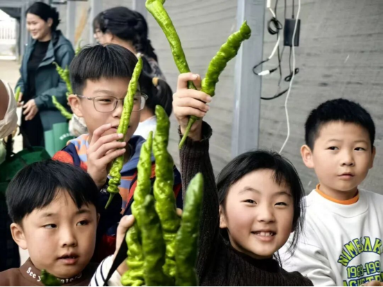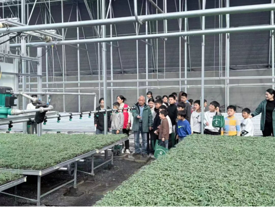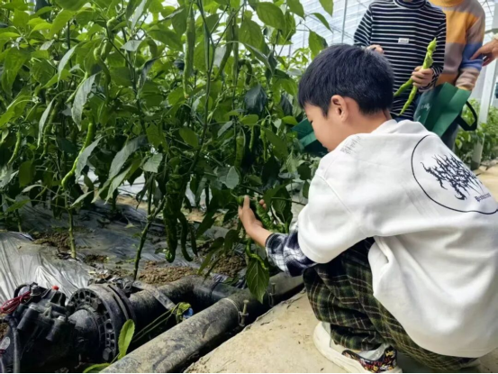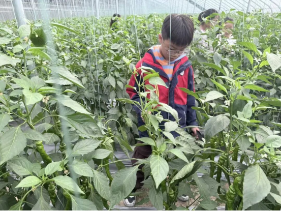 本次课程特别设置了现代农业技术参观环节,同学们有序走进西红柿育苗棚,园区技术人员现场演示了现代化的喷淋、施肥系统,水肥一体化的喷淋装置开启,均匀地滋养每一株作物。当了解到如何通过科学手段精准防控病虫害,减少农药使用,孩子们对现代化农业有了全新的认识,切身感受到了科技为传统农耕带来的巨大变革。深入浅出的知识铺垫,孩子们深刻体会到“一分耕耘,一分收获”的道理,也为接下来的亲手采摘实践做好了充分准备。