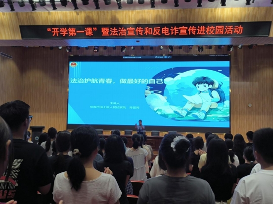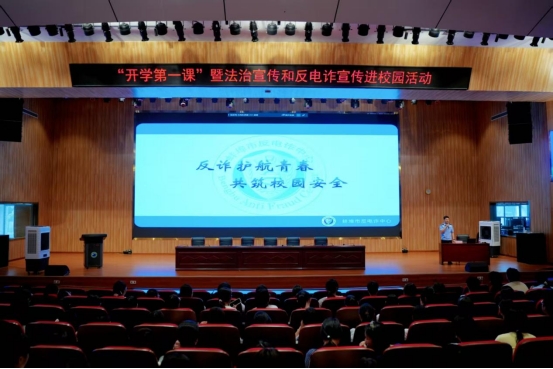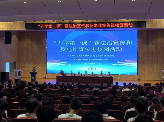 新学期伊始,为帮助辖区中、高职院校学生系好新学期第一粒扣子,增强学生的安全意识、法治观念和防范电信诈骗意识,8月30日上午,在淮上区委政法委的指导下,团区委联合淮上区人民检察院、淮上区公安分局、市公安局刑侦支队在蚌埠工业与商贸职业技术学校精心组织开展“开学第一课”暨法治宣传和反电诈宣传活动,现场800余名学生参加活动。