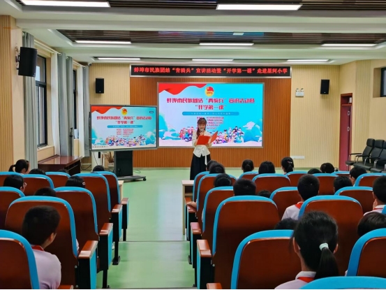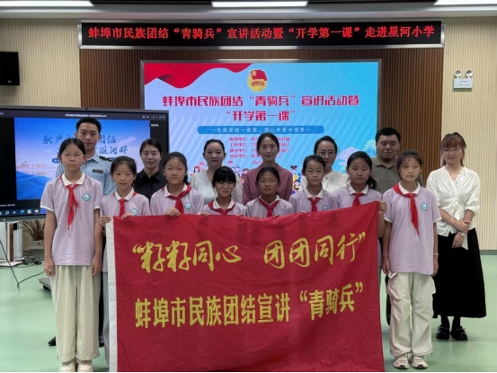 活动中,六位“青骑兵”宣讲员先后走进蚌埠市星河小学和小蚌埠镇小蚌埠社区开展宣讲,他们以鲜活的故事、深刻的感悟、饱满的热情,将民族团结的种子播撒在每一位听众心中,为构建“籽籽同心 团团同行”的美好画面注入了青春动能。从《燃民族魂,聚民族力》的聚力同心到《歌谣袅袅促团结 石榴花开淮河畔》的多元交融,为听众们勾勒出新时代各民族同心奋进的传承脉络和生动图景。