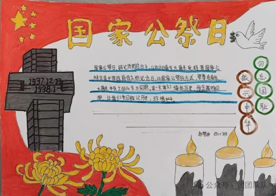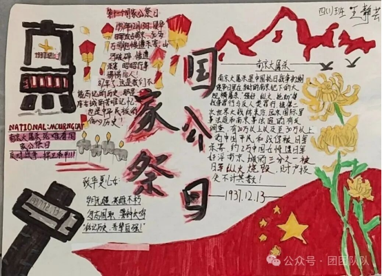 四年级队员精心制作国家公祭日手抄报,队员们以画笔为媒,将对历史的铭记、对和平的向往绘于纸上,每一笔色彩都承载着少年的责任与担当。