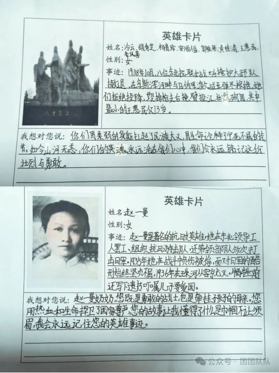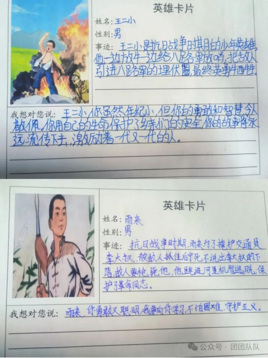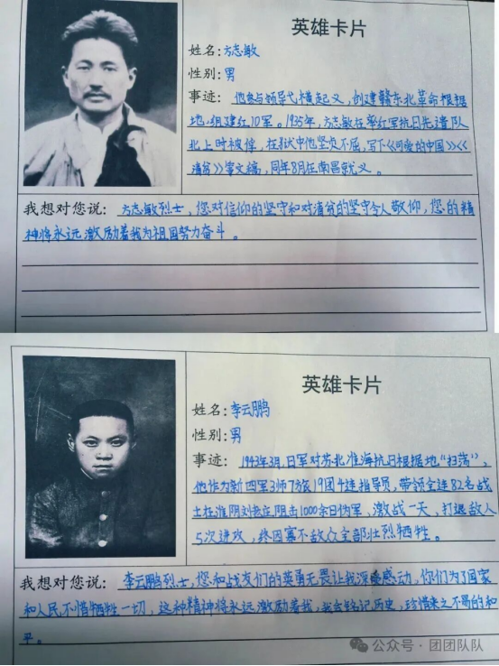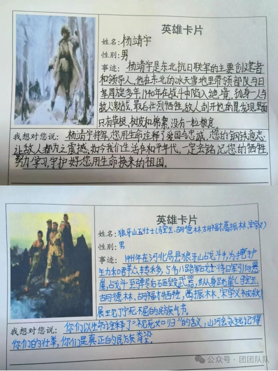 五年级队员制作抗日英雄卡,一张张英雄卡,记录着抗日英烈的英勇事迹,也让学生在搜集、制作的过程中,深刻感悟英雄精神的力量,树立向英雄学习的远大志向。