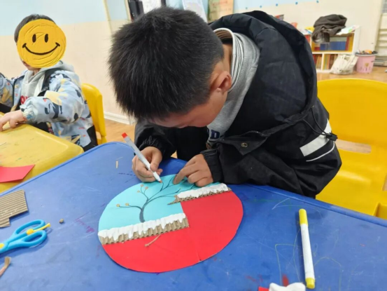 随后的手工制作环节,孩子们在老师指导下动手创作冬至主题作品。从准备材料、剪裁、粘贴到绘画,每一步都由孩子们独立完成。大家专注投入、耐心细致,在不断尝试中收获进步。当色彩鲜艳、充满童趣的作品完成时,孩子们脸上都露出了自豪与喜悦。