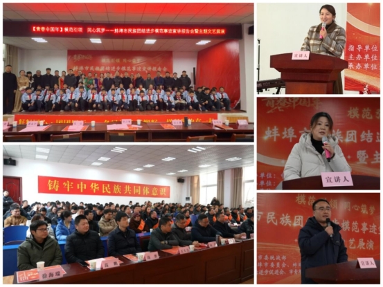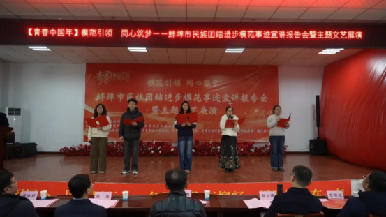 蚌埠市民族团结进步模范事迹宣讲报告会暨主题文艺展演同步举办。市委统战部副部长柴启明,怀远县委副书记、魏庄镇党委书记张亮,安徽省第一水文院党委书记、院长郑立博,团市委副书记潘俞伊、蔡明星等出席。活动在市青年书法家协会书写春联的浓郁年味中拉开序幕,随后以民族歌舞、乐器演奏、诗歌朗诵等多种艺术形式,展示了各民族文化互鉴融通、美美与共生动局面。其间,三位在全省民族团结进步表彰大会上的获奖代表分别围绕青年民族团结工作、社区民族工作实践、基层服务等主题进行了宣讲,生动诠释了“同心筑梦”的深刻内涵。
