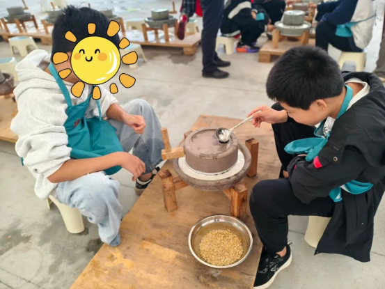 进入实践环节,指导老师耐心讲解和示范,孩子们亲手参与石磨豆浆的制作,从添豆、推磨到滤浆,每一个步骤都充满了新奇与探索,感受古人的智慧与匠心,体验劳动的乐趣与价值。真正实现了在“做”中体验,在“玩”中探索,让中华优秀传统文化的种子在孩子们心中生根发芽。