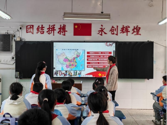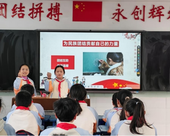 师范附属小学刘振娜老师担任本次活动“青骑兵”,以“听、想、做”三维度展开宣讲:“听一听”环节,通过国家级非遗卫调花鼓戏(融合汉、回等民族音乐元素),让少先队员们感受多民族文化交融之美;“想一想”环节,结合校园小事(如回族同学分享馓子、汉族同学教藏族同学写汉字),引导队员们理解“尊重差异、团结互助、传承文化”的内涵;“做一做”环节,发起“手拉手结对”“文化小达人挑战”“微心愿征集”三大行动倡议。