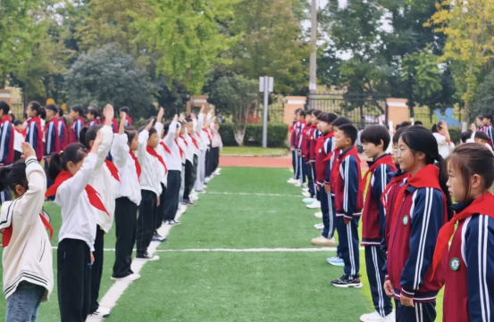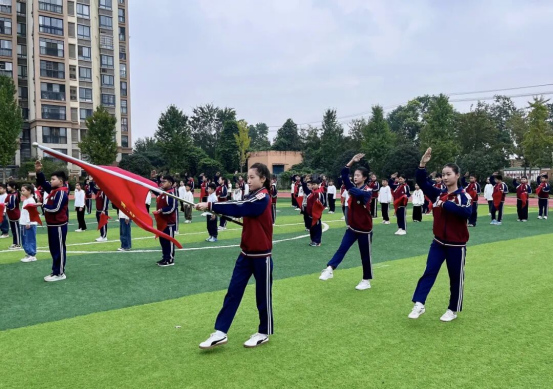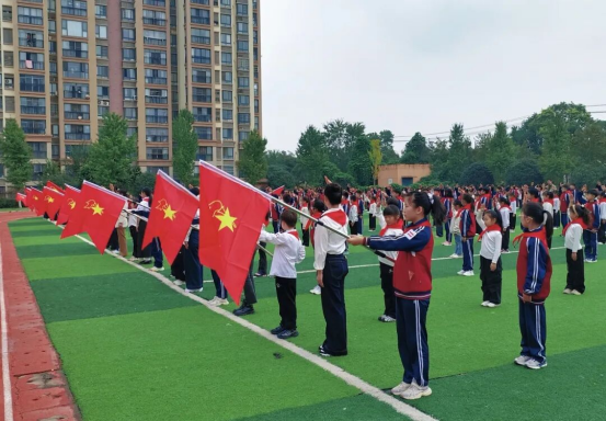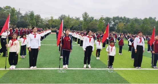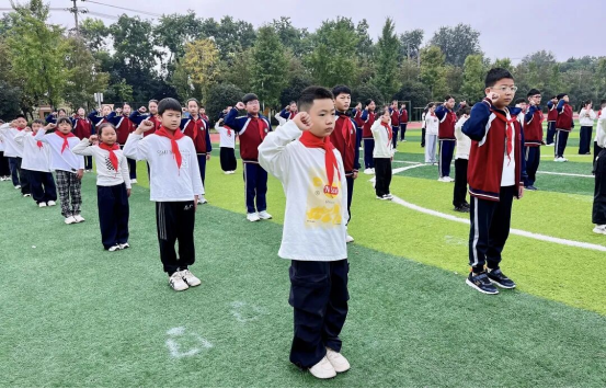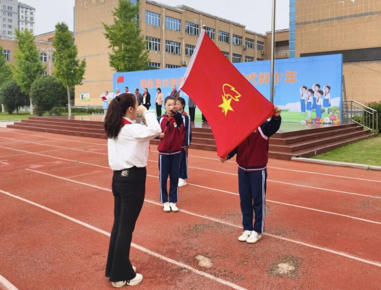 仪式在雄壮激昂的出旗曲中正式开始,老队员手持队旗,步伐整齐,全体少先队员敬礼注视。随后,全场齐声高唱《中国少年先锋队队歌》,少先队员们精神饱满,歌声嘹亮,展现了积极向上的精神风貌。