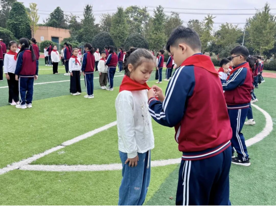 在宣布新队员名单后,老队员为新队员佩戴上鲜艳的红领巾。新队员在大队长的带领下,高举右拳,庄严宣誓,铿锵的誓言在校园上空回荡,表达了他们为共产主义事业贡献力量的决心。