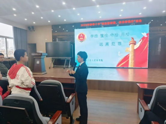 副检察长以“学法、懂法、守法、用法,远离犯罪”为主题,通过“法律条文+生活场景”的讲解方式,将抽象法律转化为具体行为准则,以校园伤害致人死亡的案件、交通事故、网络诈骗、校园欺凌等七个案件为例,向同学们详细讲述此类案件给家人、社会带来的巨大伤害。同时徐丹检察长通过“沉浸式体验”激发学生参与热情,讲座中学生分组抢答“遇到校园欺凌如何取证”“如何识别网络诈骗”等问题,答对者获赠法制宣传册。有学生根据生活中的法律问题向徐检察长提问,检察官也积极回应:“真正的朋友不会让你陷入危险,拒绝时要坚定但避免冲突,及时向老师或家长求助,或者选择报警解决问题。”