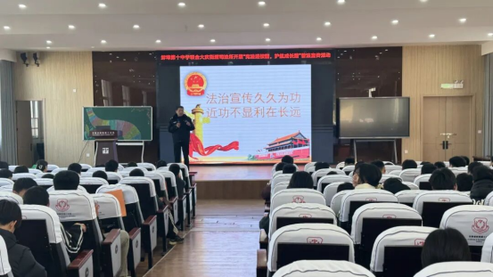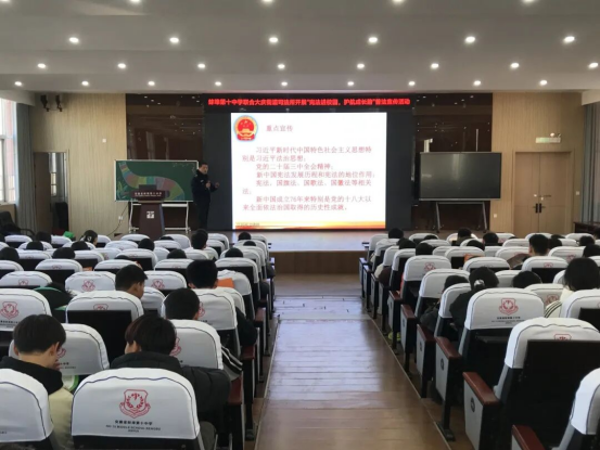 为深入贯彻落实习近平法治思想,弘扬宪法精神,筑牢校园安全防线,12月3日下午,蚌埠十中联合禹会区大庆社区司法所及大庆派出所,共同举办“法治护航青春路”主题教育讲座。禹会区大庆社区司法所高焕廷所长与大庆派出所王咚警官联袂授课,以“沉浸式”普法模式为全校师生带来一场思想深刻、形式生动的法治盛宴。